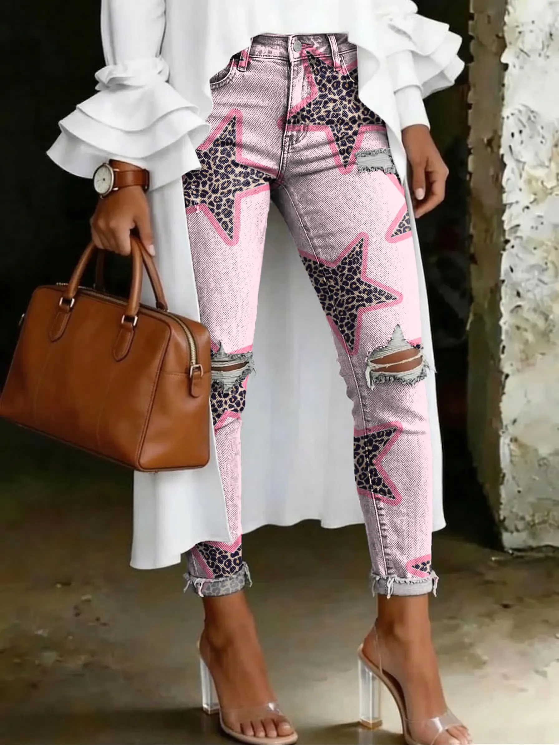 Pink Star Leopard Print Artistic Print Casual Ripped Skinny Jeans