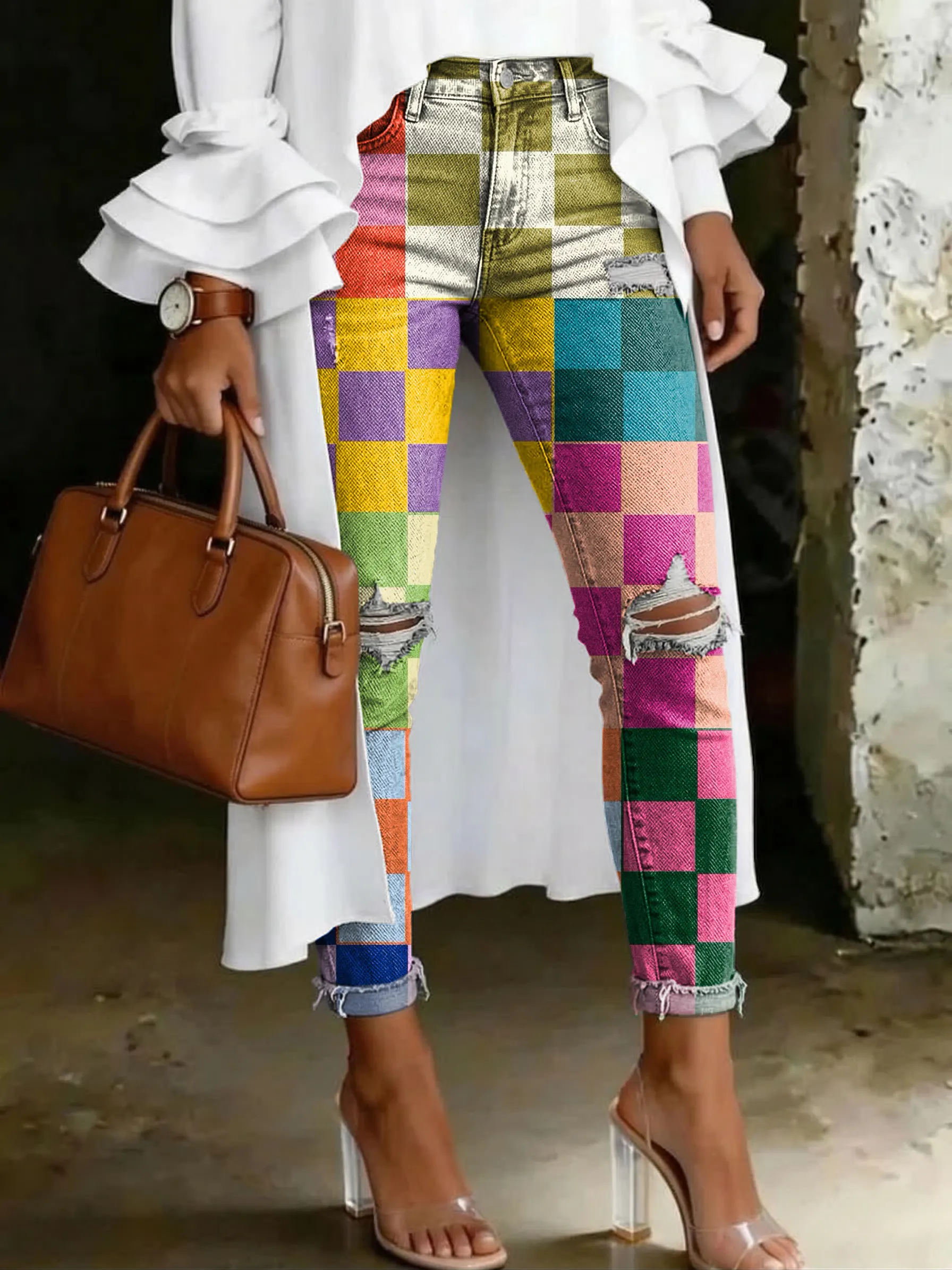 Retro Color-blocked Checkered Pattern Artistic Print Casual Ripped Skinny Jeans