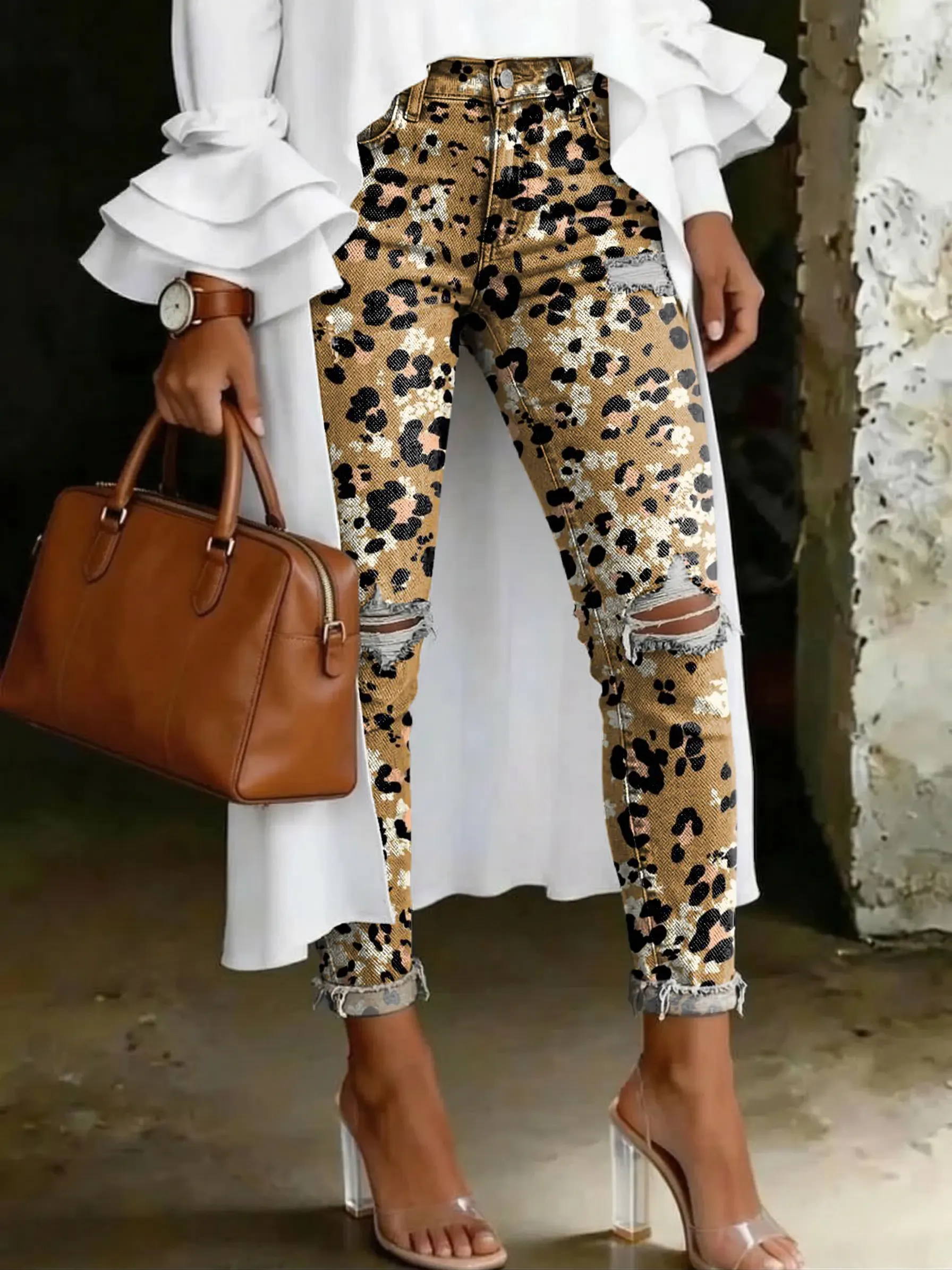 Retro Floral Leopard Print Artistic Print High-waisted Casual Ripped Skinny Jeans