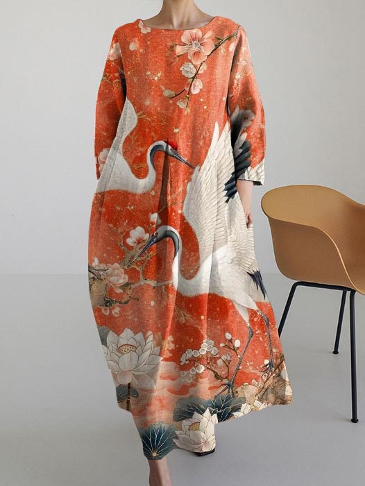 Retro Japanese Art Print Round Neck Long Sleeve Dress