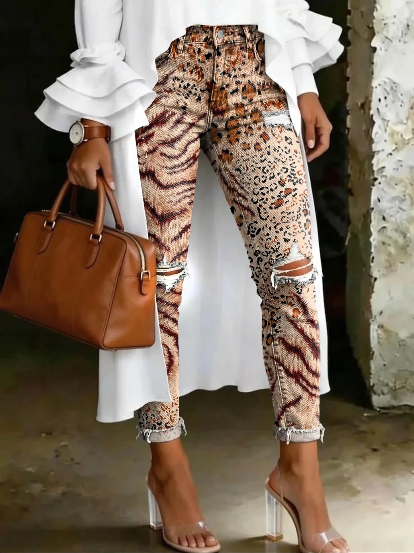 Retro Leopard Print Artistic Print High-waisted Casual Ripped Skinny Jeans