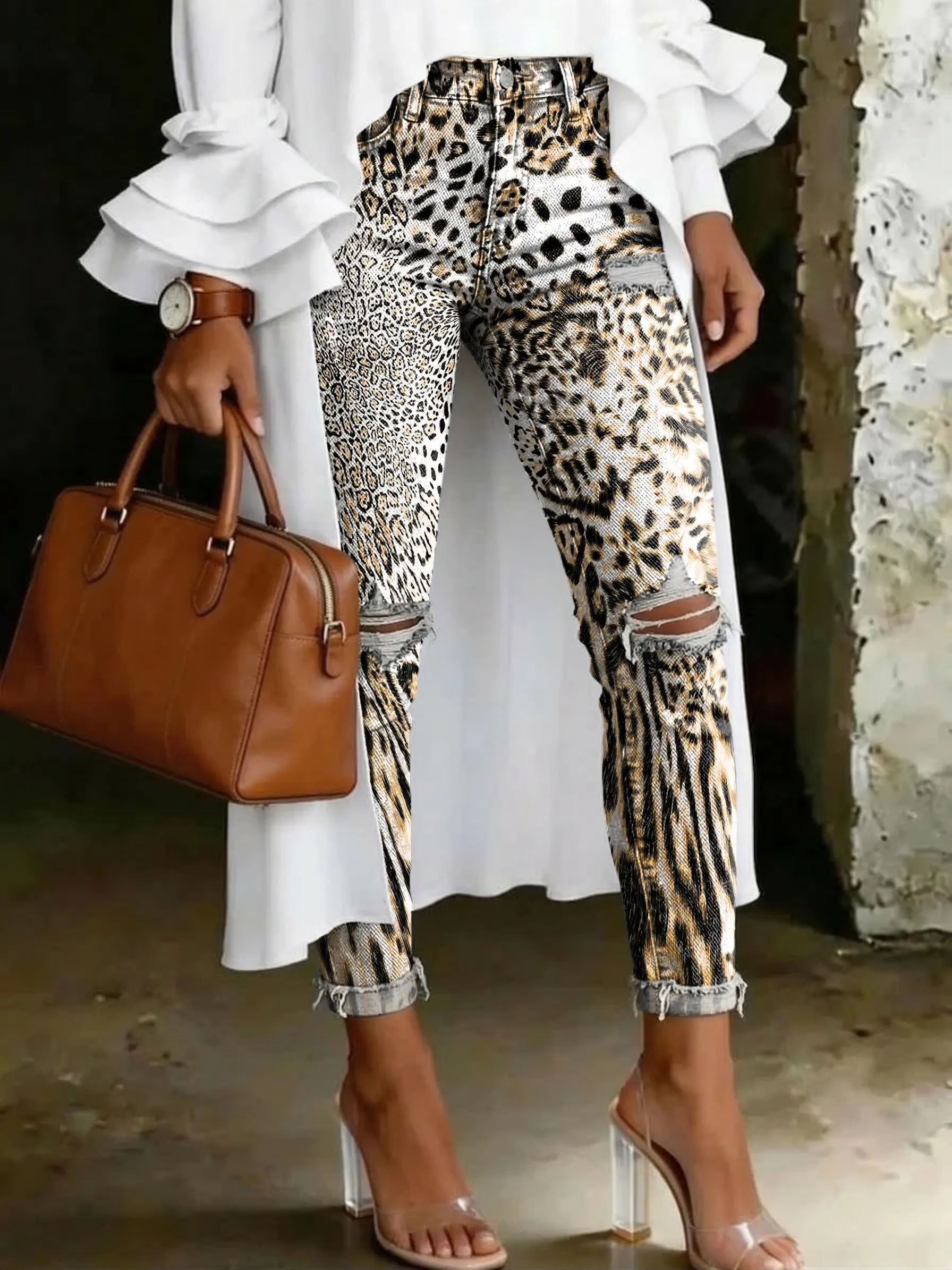 Retro Leopard Print Artistic Print Ripped Casual Skinny Jeans