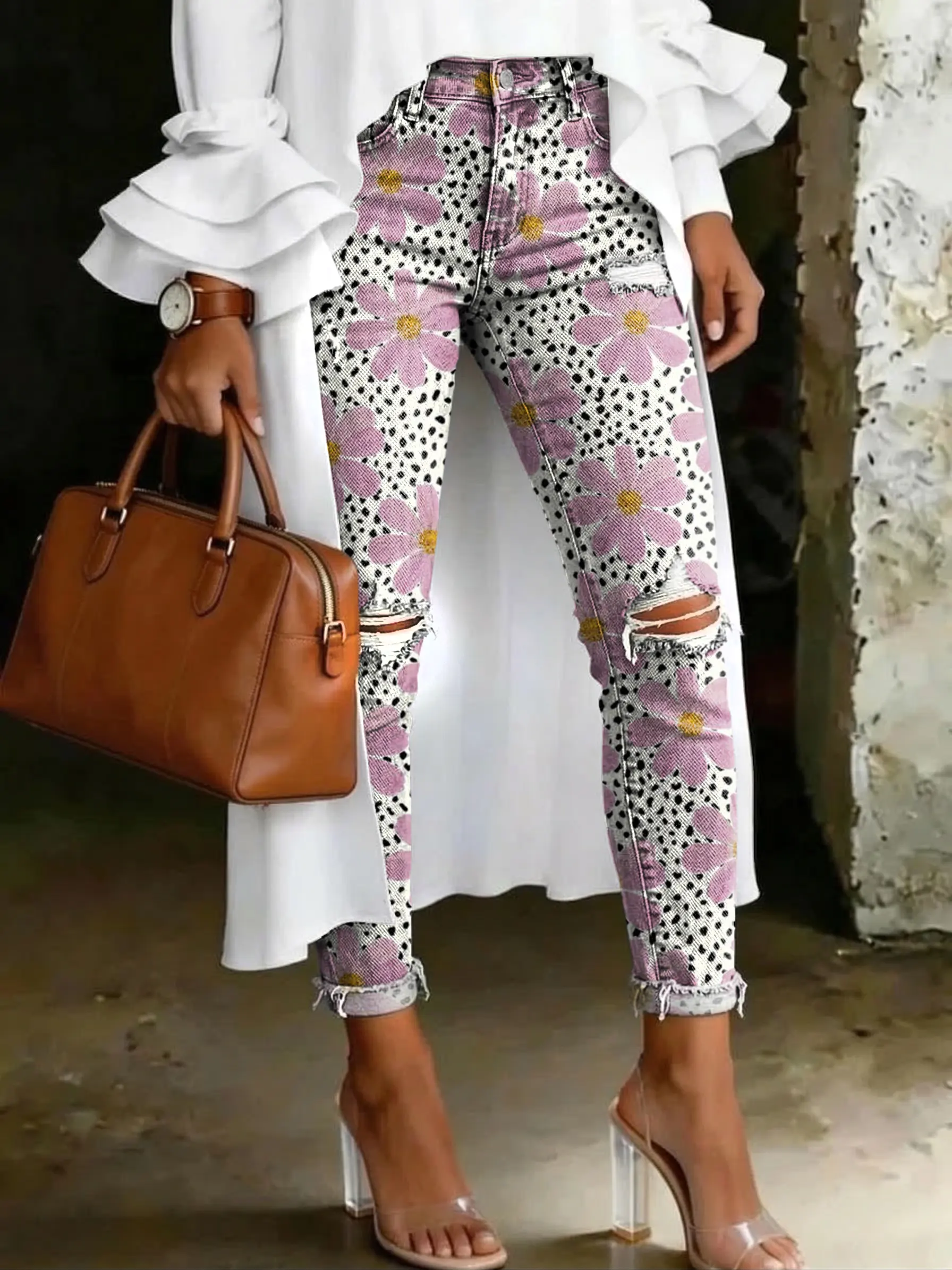 Retro Polka Dot Floral Artistic Print Casual High-waisted Skinny Ripped Jeans