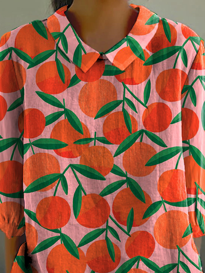 Summer Tangerine Fruit Pattern Printed Women's Casual Cotton And Linen 3/4 Sleeve Shirt