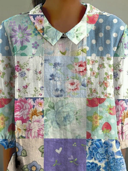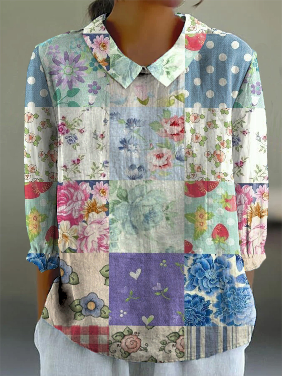 Vintage Floral Patchwork Pattern Printed Women's Casual Cotton And Linen 3/4 Sleeve Shirt