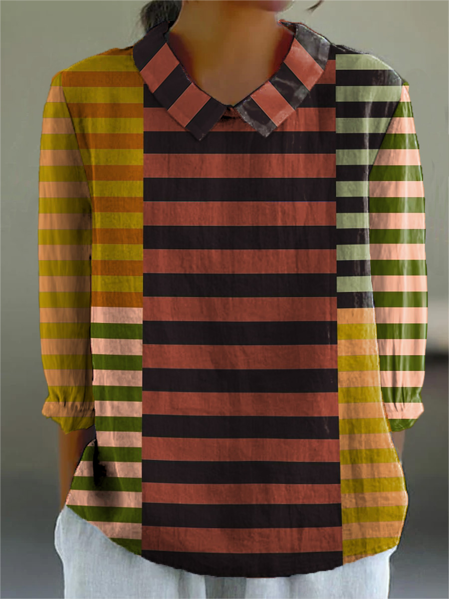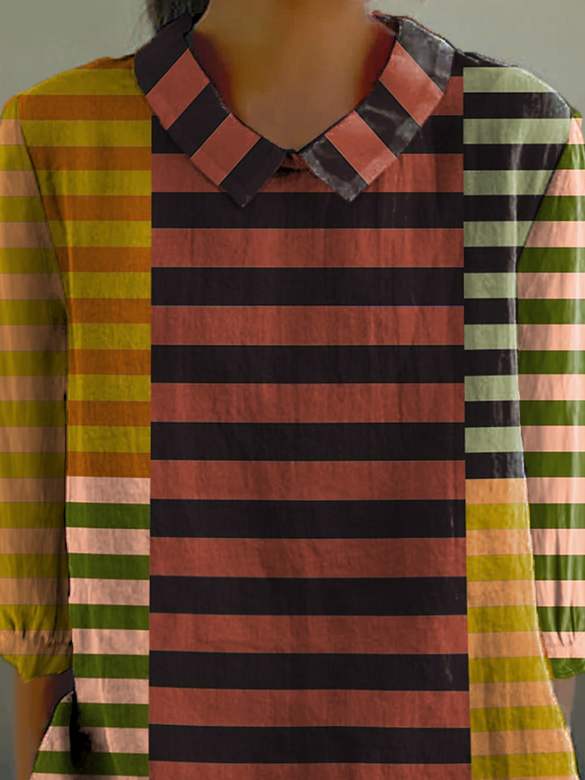 Vintage Geometric Strip Pattern Printed Women's Casual Cotton And Linen 3/4 Sleeve Shirt