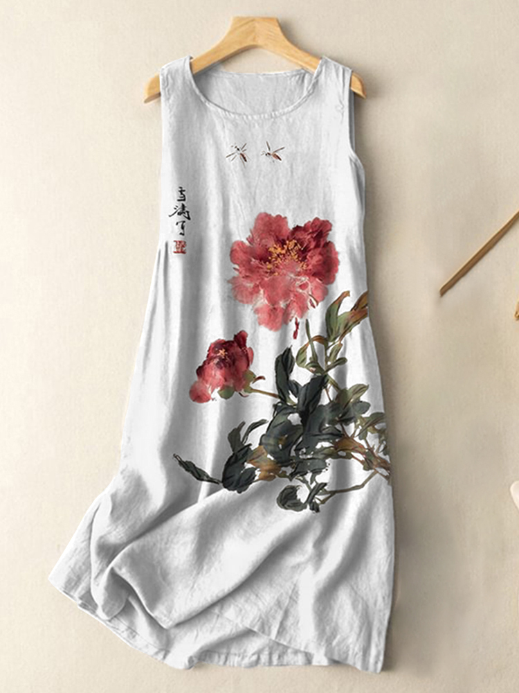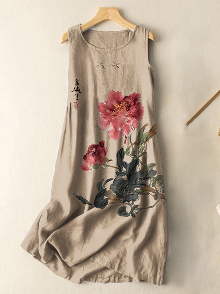 Vintage Japanese Ink Flower Calligraphy Art Print Sleeveless Cotton And Linen Midi Dress