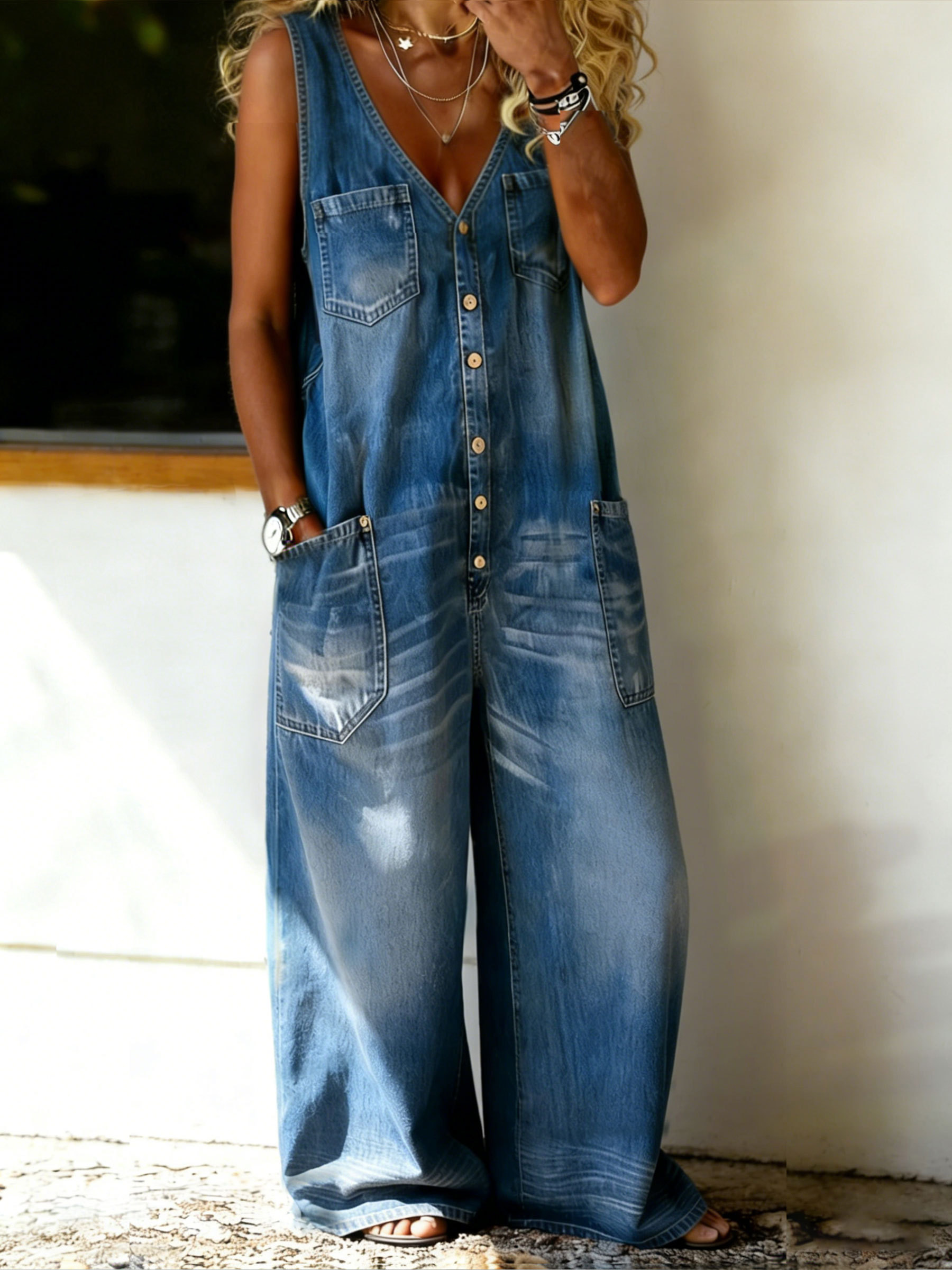 Women’s Casual V-neck Sleeveless Denim Jumpsuit