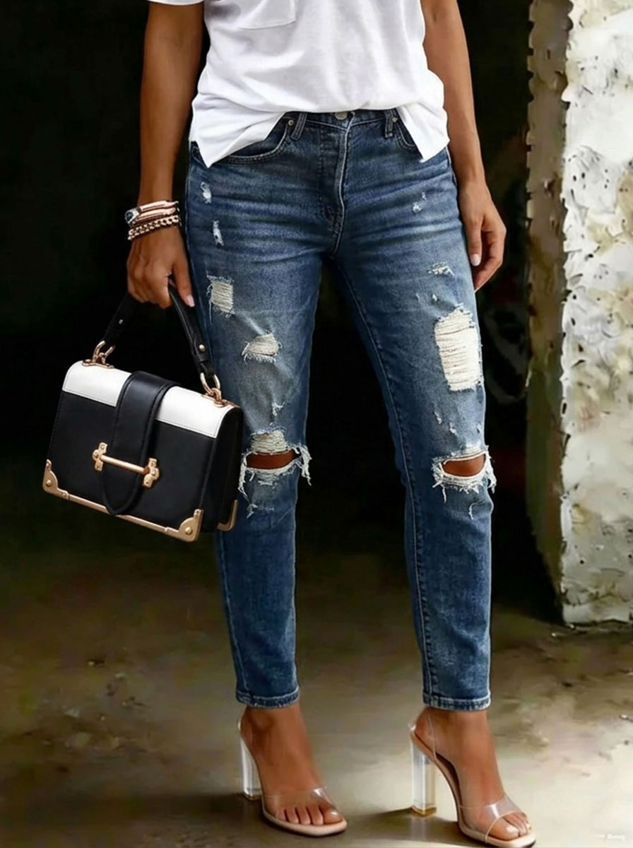 Women’s Stylish Casual Brushed Denim Distressed Holes Denim Pants