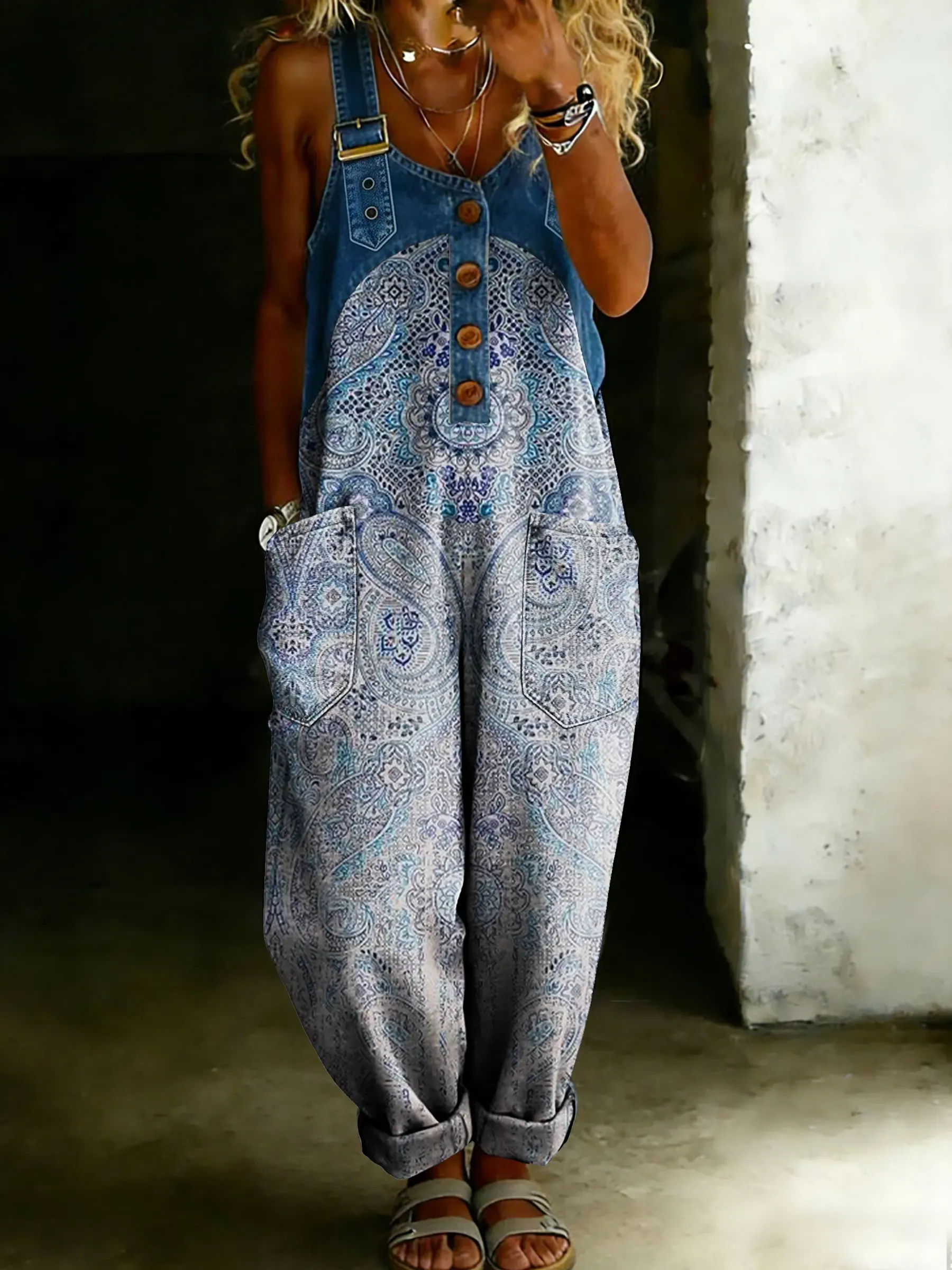 Women’s Vintage Ethnic Totem Art Casual One Piece Denim Patchwork Jumpsuit
