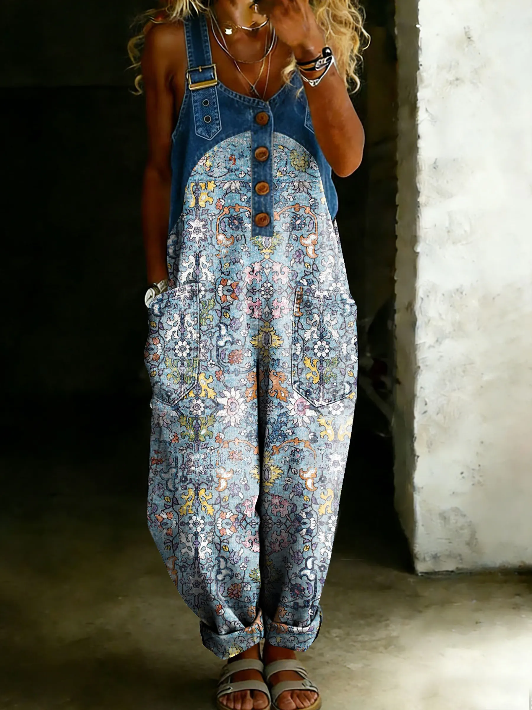 Women’s Vintage Floral Art Casual One Piece Denim Patchwork Jumpsuit