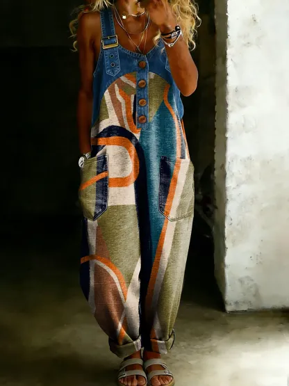 Women’s Vintage Line Totem Art Casual One Piece Denim Patchwork Jumpsuit