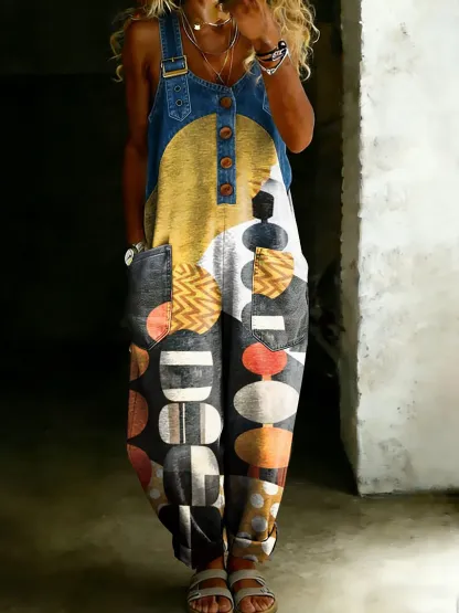 Women’s Vintage Totem Art Casual One Piece Denim Patchwork Jumpsuit