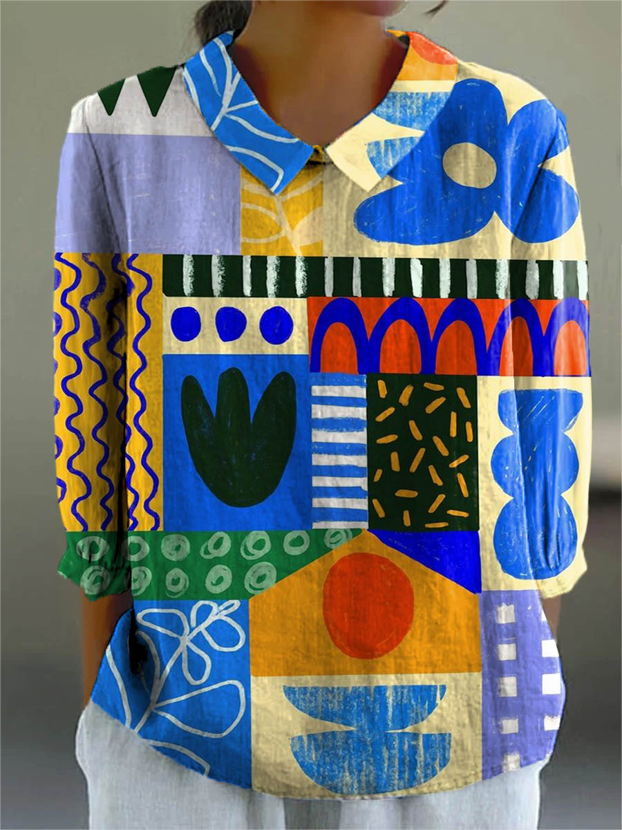 Women's Abstract Geometric Pattern Art Print Casual Cotton And Linen 3/4 Sleeve Shirt