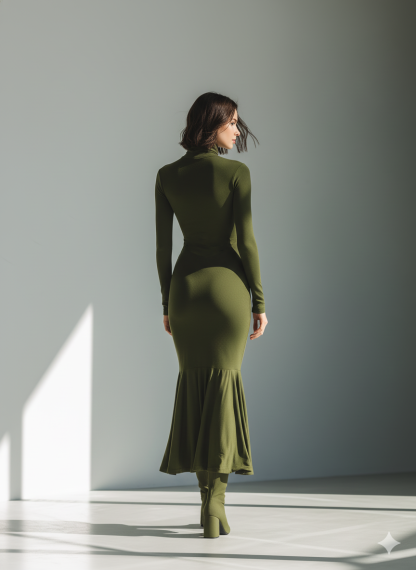 A sleek, body-skimming knit dress in army green with a high neck and elegant pleats for a refined evening look.