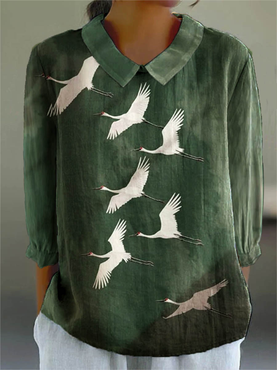 Women's Artistic Crane Pattern Casual Cotton And Linen Top