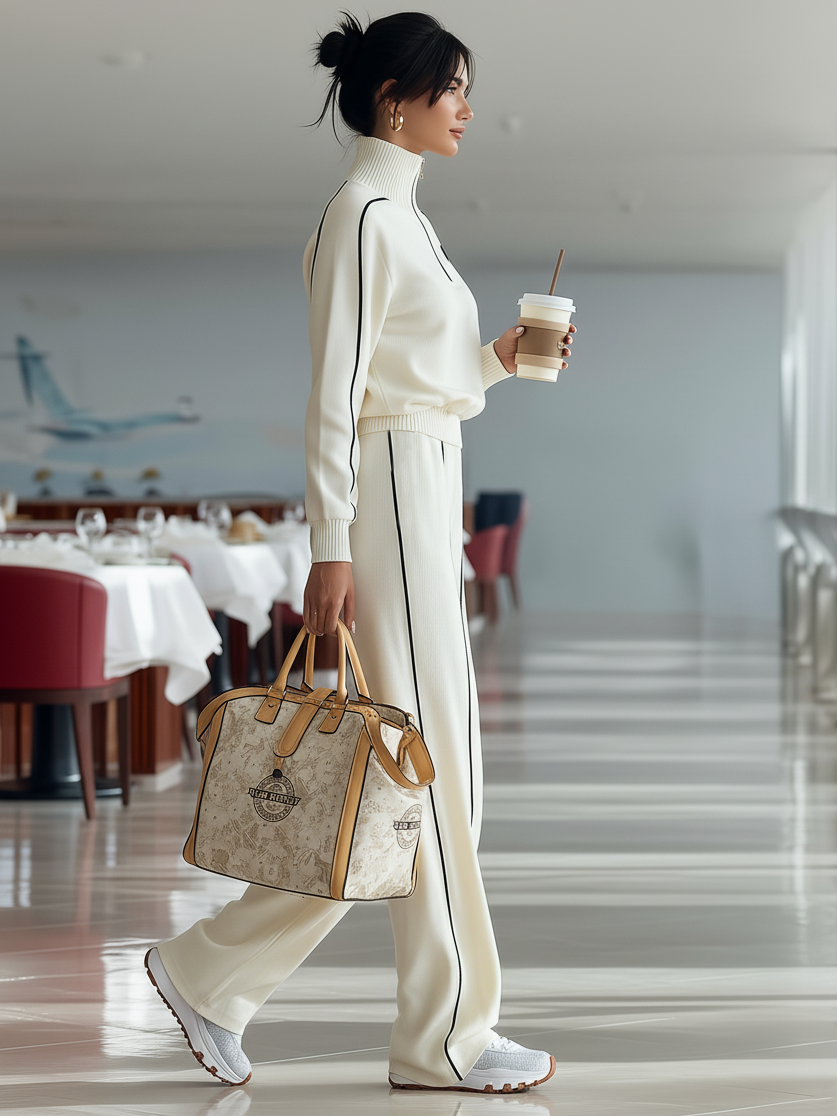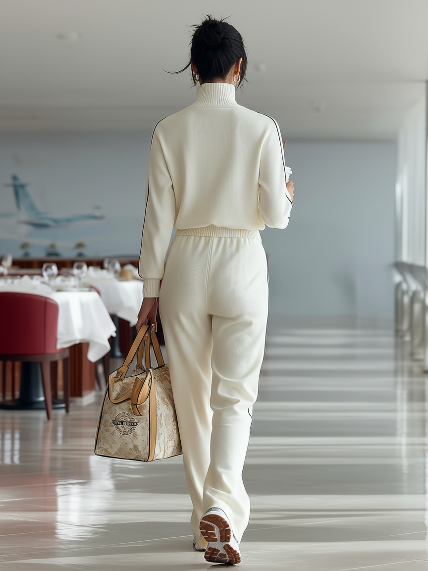 Women's Casual Ribbed Black Trim Zipper Half Turtleneck Sports Set