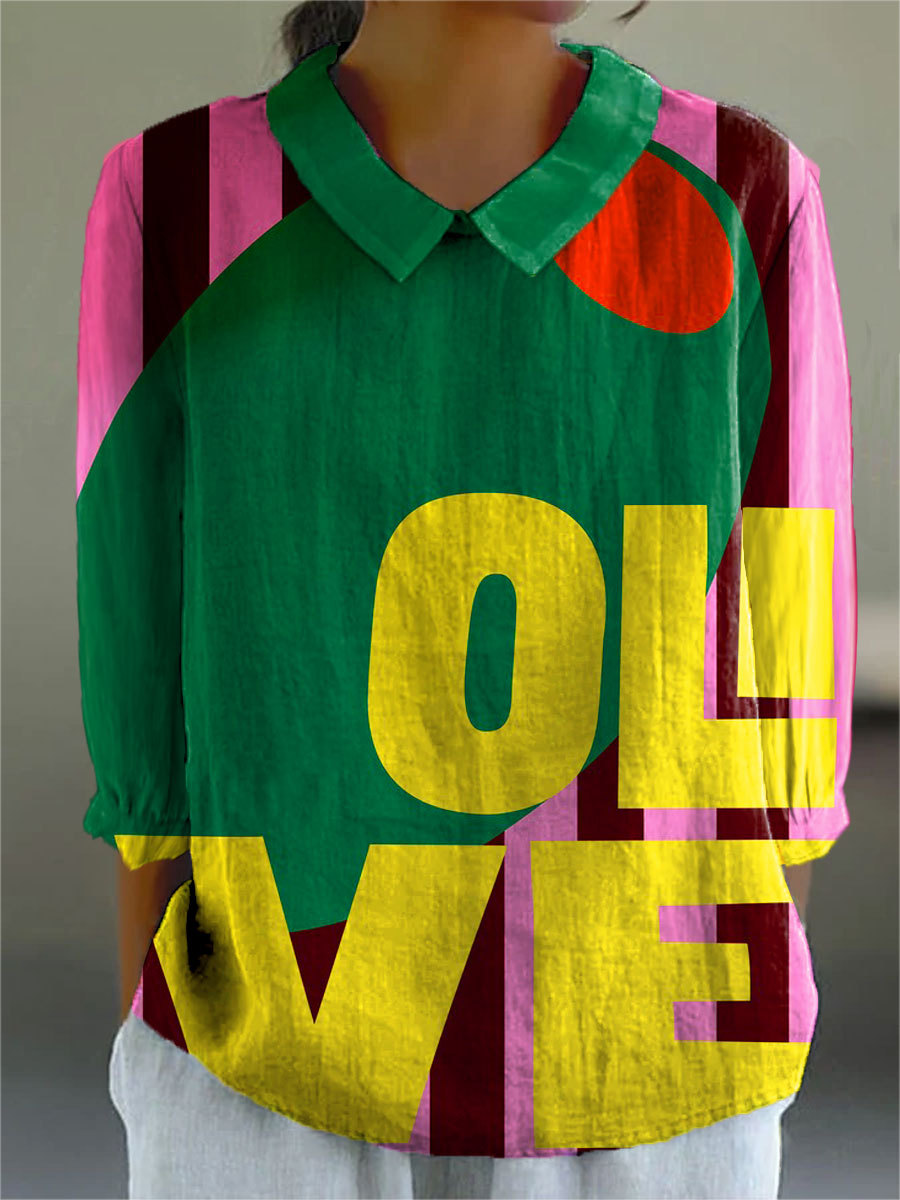 Women's Colorful Geometric Love Art Print Casual Cotton And Linen 3/4 Sleeve Shirt
