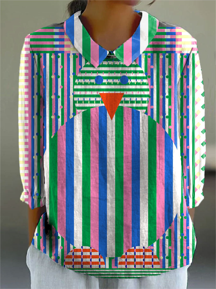 Women's Colorful Stripes Abstract Cute Art Print Casual Cotton And Linen 3/4 Sleeve Shirt