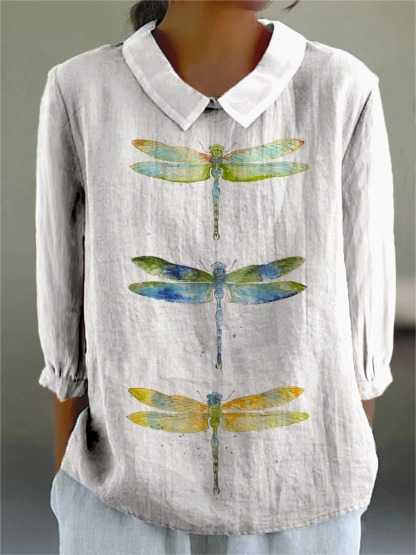 Women's Dragonfly Pattern Art Print Casual Cotton And Linen 3/4 Sleeve Shirt