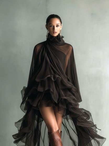 An elegant chiffon midi dress in a rich brown tone, designed with a high neckline and long sleeves. The loose-fitting silhouette and lightweight fabric create a graceful, airy look with timeless sophistication.