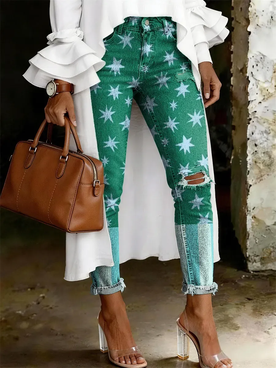 Women's Fashion Casual Art Print Ripped Skinny Jeans