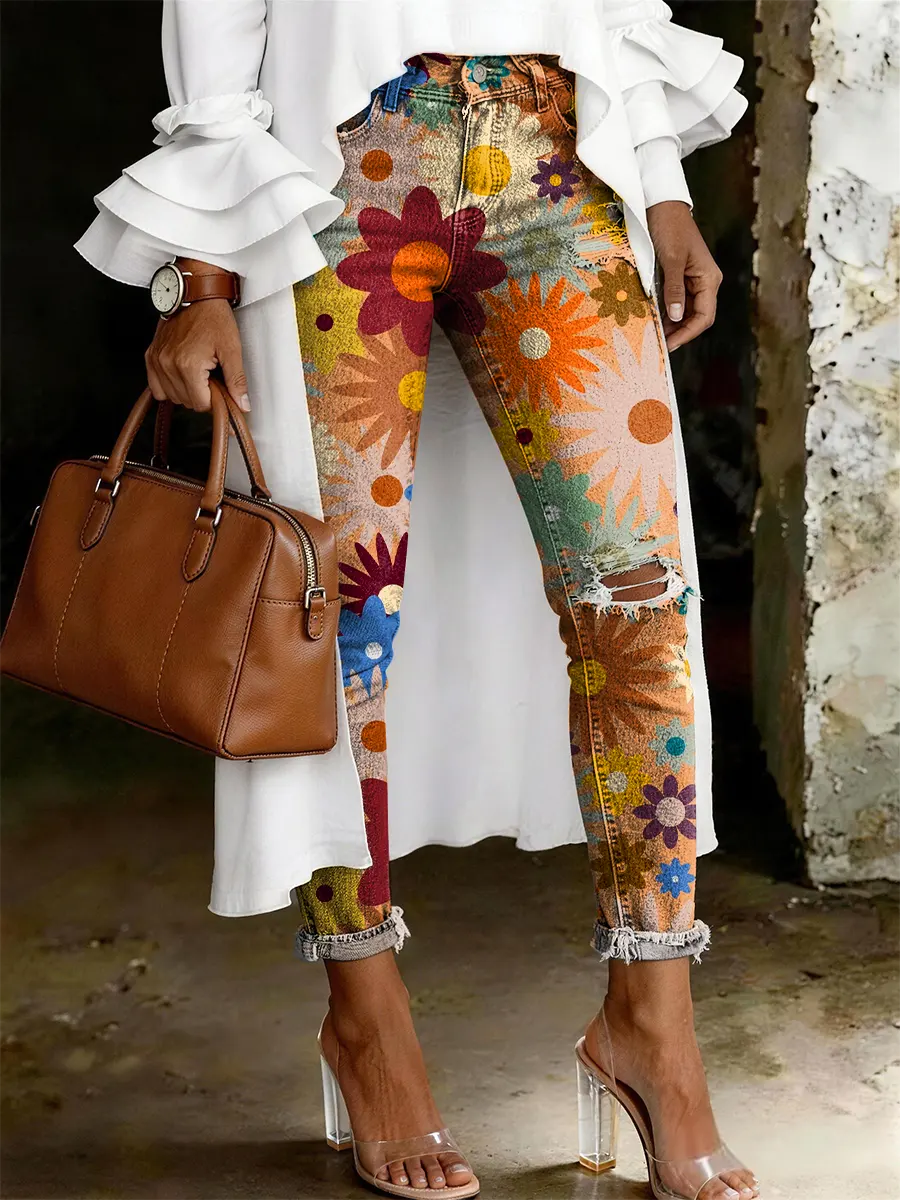 Women's Fashion Casual Flowers Print Ripped Skinny Jeans