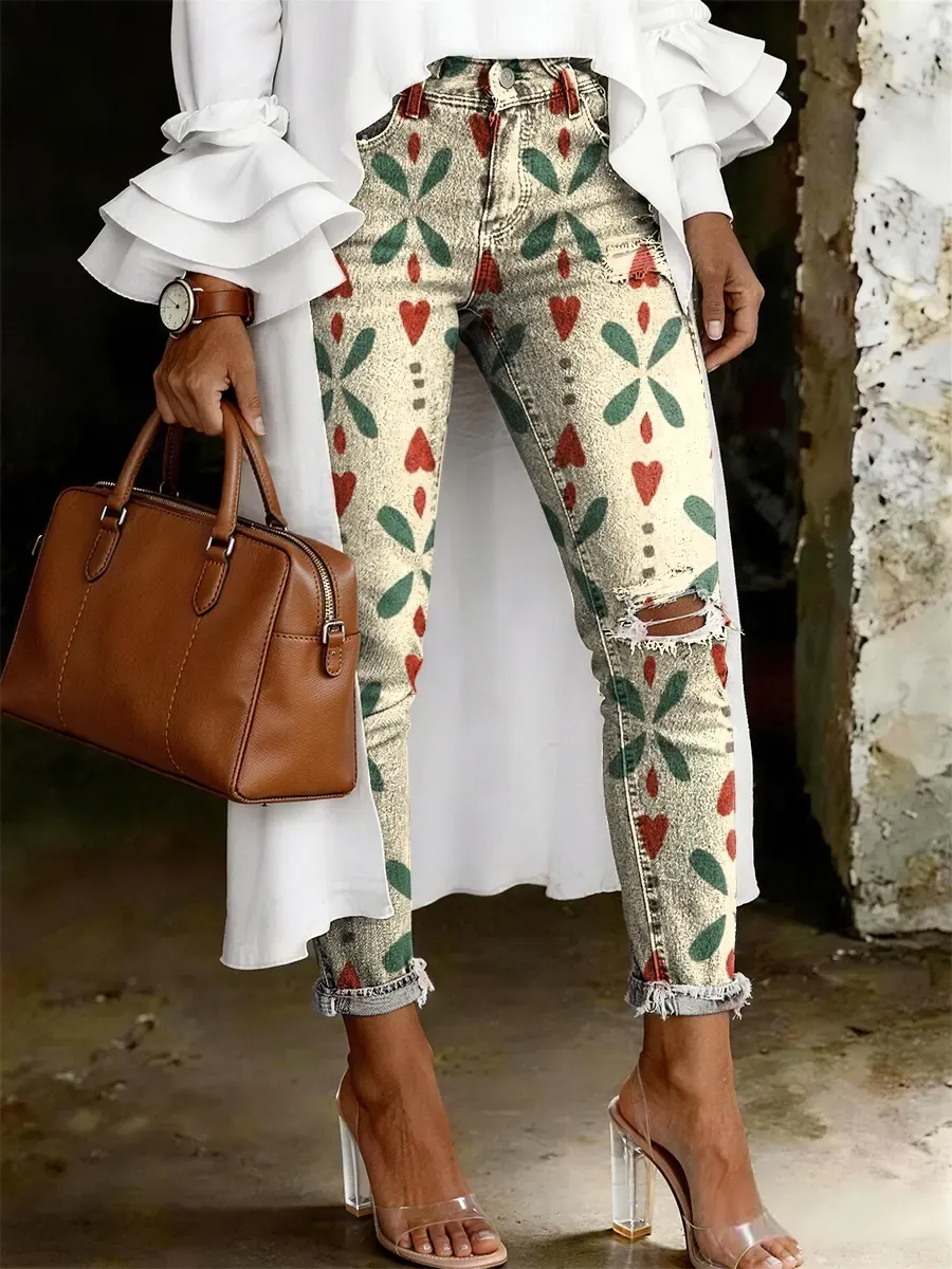 Women's Fashion Casual Retro Floral Print Ripped Skinny Jeans