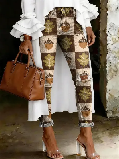 Women's Fashion Casual Retro Maple Leaf Print Ripped Skinny Jeans