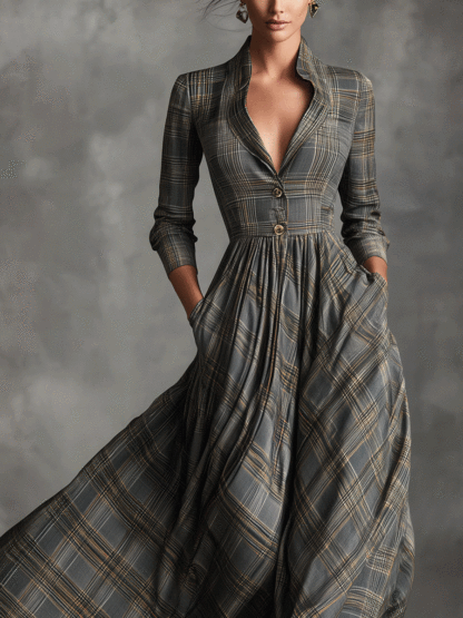 A grey linen-blend maxi dress with a tartan pattern. It flows beautifully for a refined, graceful look.