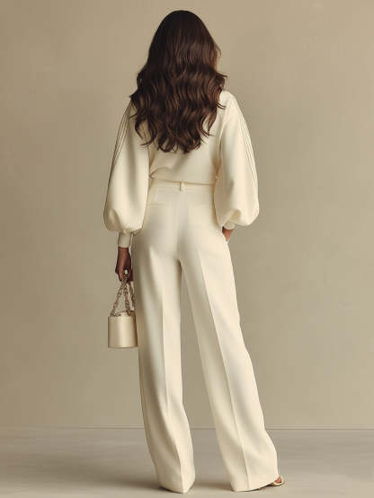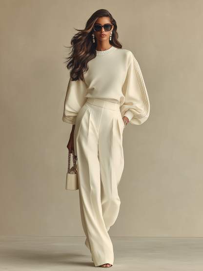 Women’s Ivory Textured Set With Ribbed Crew Neck & High-Waisted Bottoms, Modern Sophisticated Style Set
