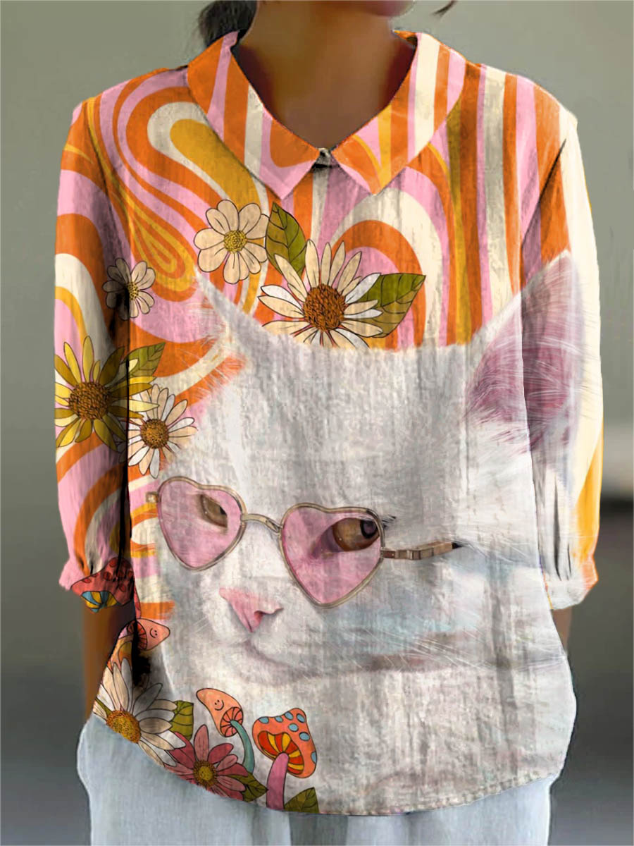Women's Lovely Cat Floral Pattern Art Print Casual Cotton And Linen 3/4 Sleeve Shirt