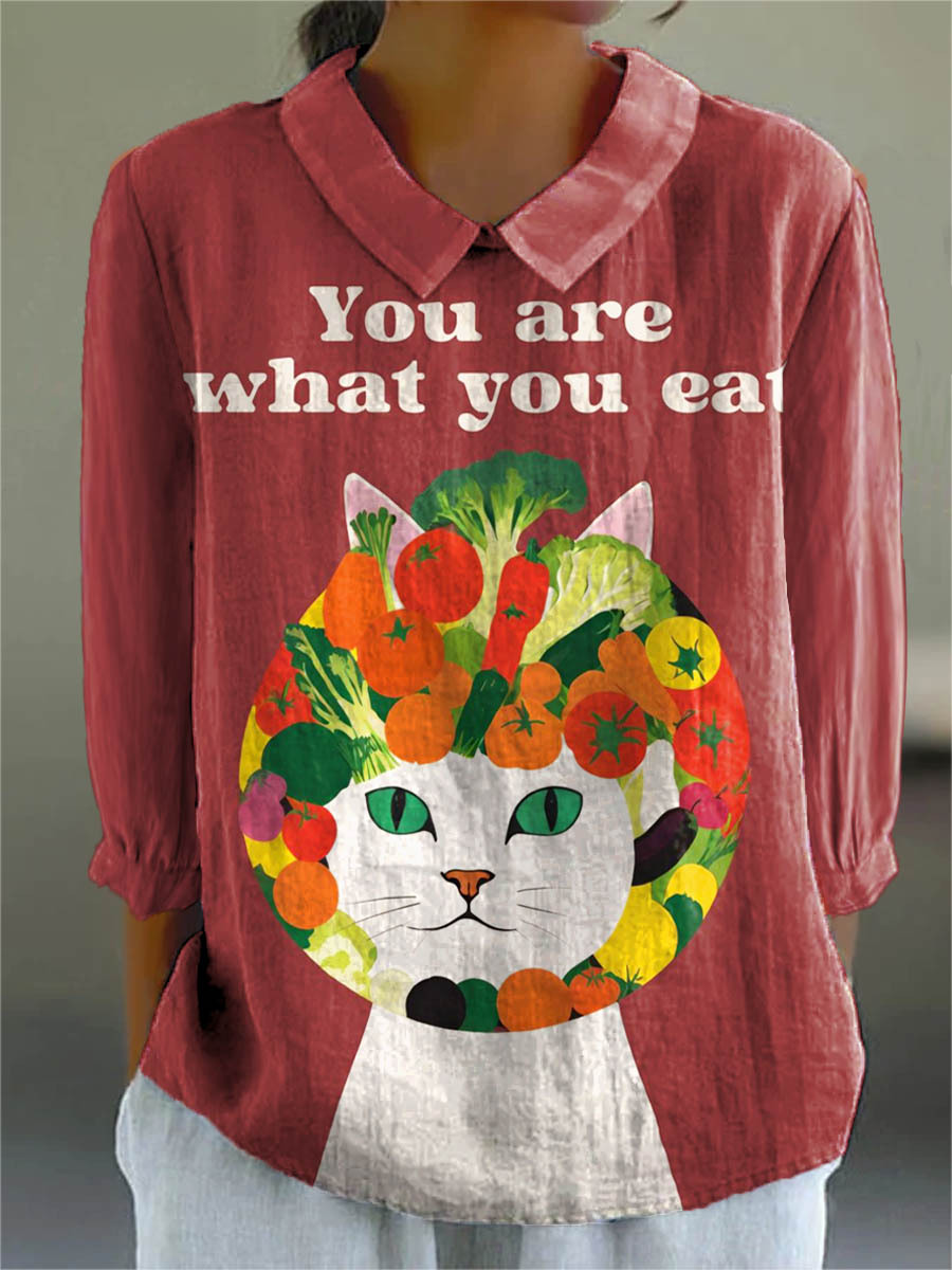 Women's Lovely Cat Fruit Pattern Art Print Casual Cotton And Linen 3/4 Sleeve Shirt