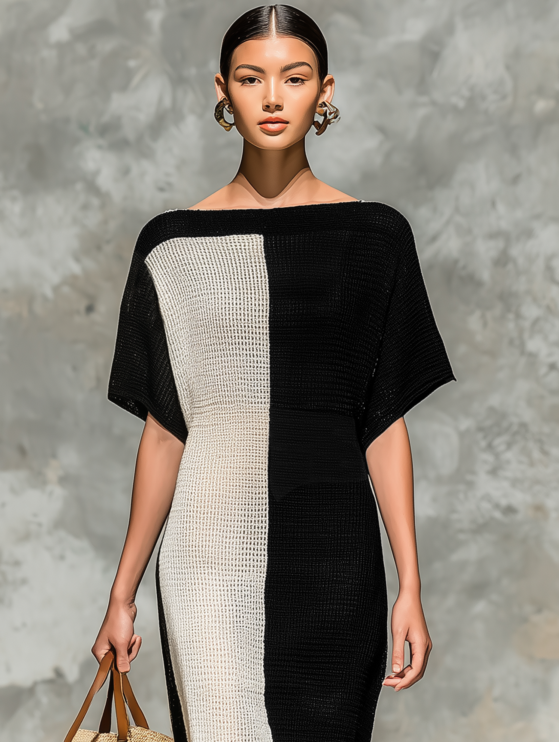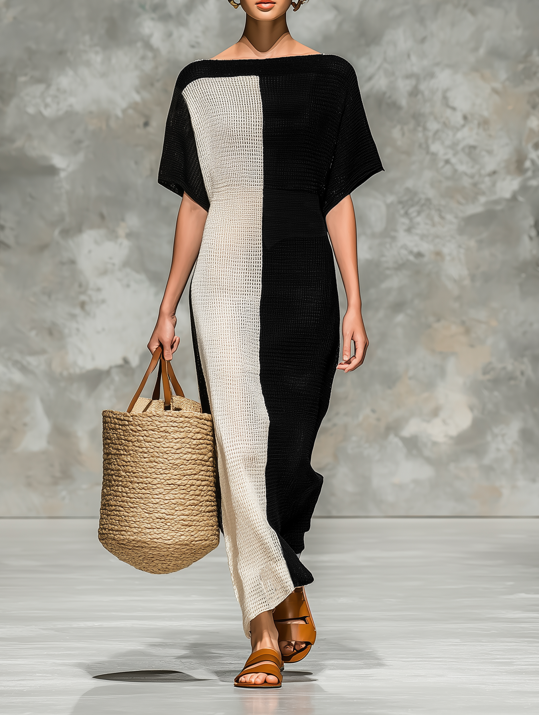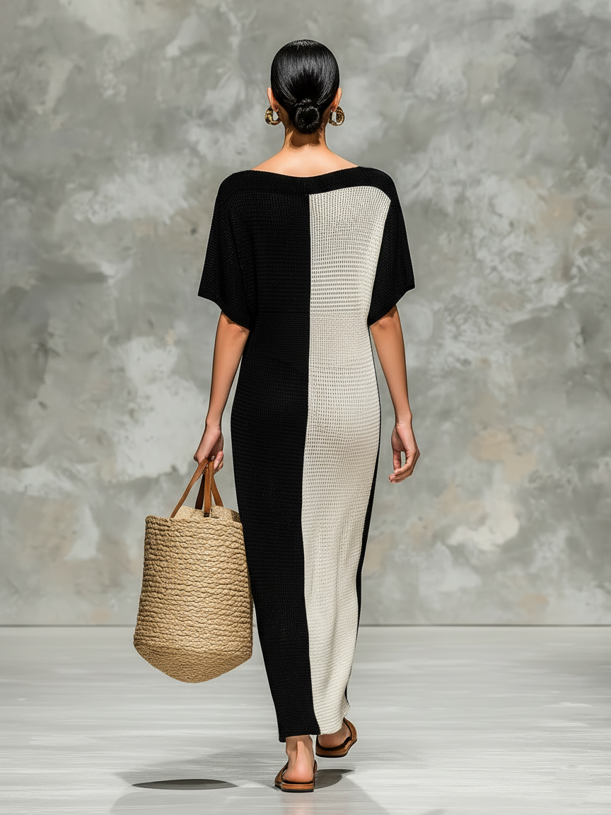 A minimalist knitted maxi dress designed with a flattering boat neckline and short sleeves, offering effortless elegance and everyday comfort.