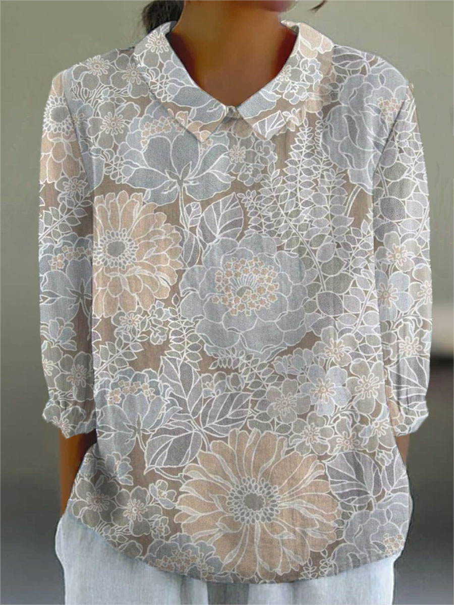 Women's Pastoral Flowers Print Casual Cotton And Linen 3/4 Sleeve Shirt