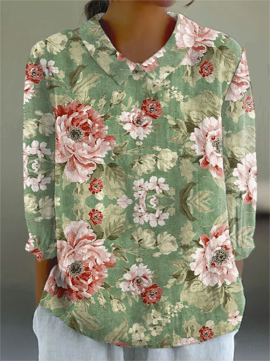 Women's Pastoral Flowers Print Casual Cotton And Linen 3/4 Sleeve Shirt