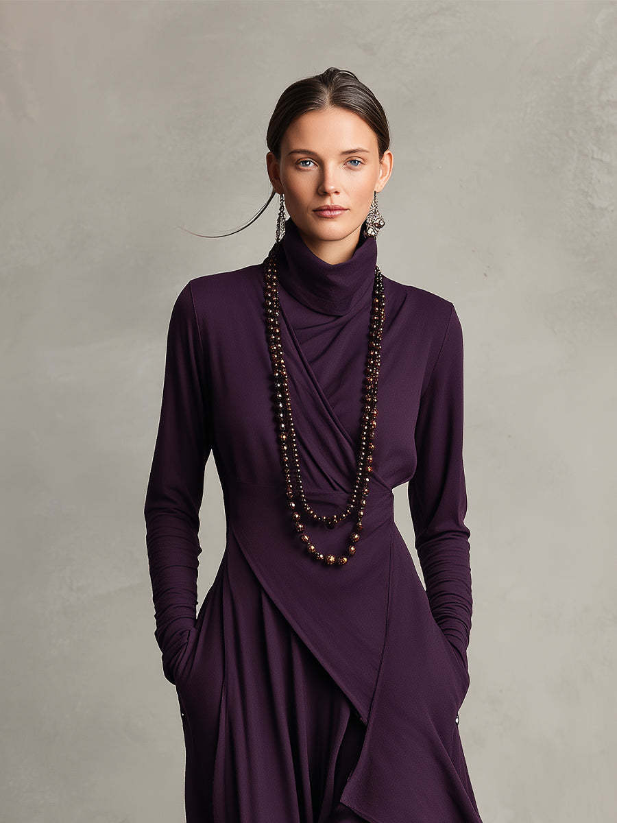 A purple Cotton maxi dress with a turtleneck and draped, asymmetric detailing. It’s relaxed, bohemian, and perfect for casual to semi-formal events.