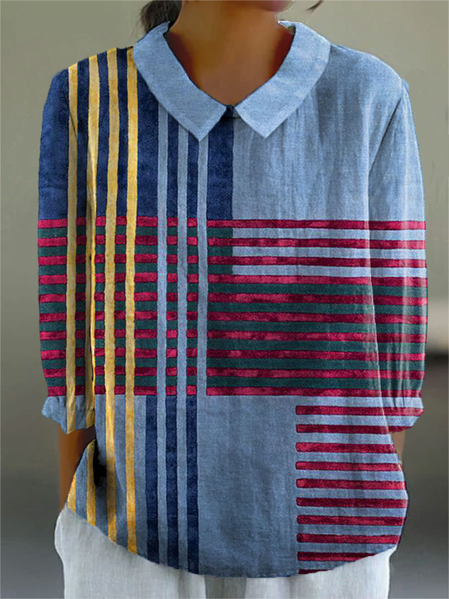 Women's Retro Abstract Stripes Art Print Casual Cotton And Linen 3/4 Sleeve Shirt