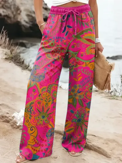 Women's Retro Ethnic Floral Art Printed Cotton And Linen Casual Pants