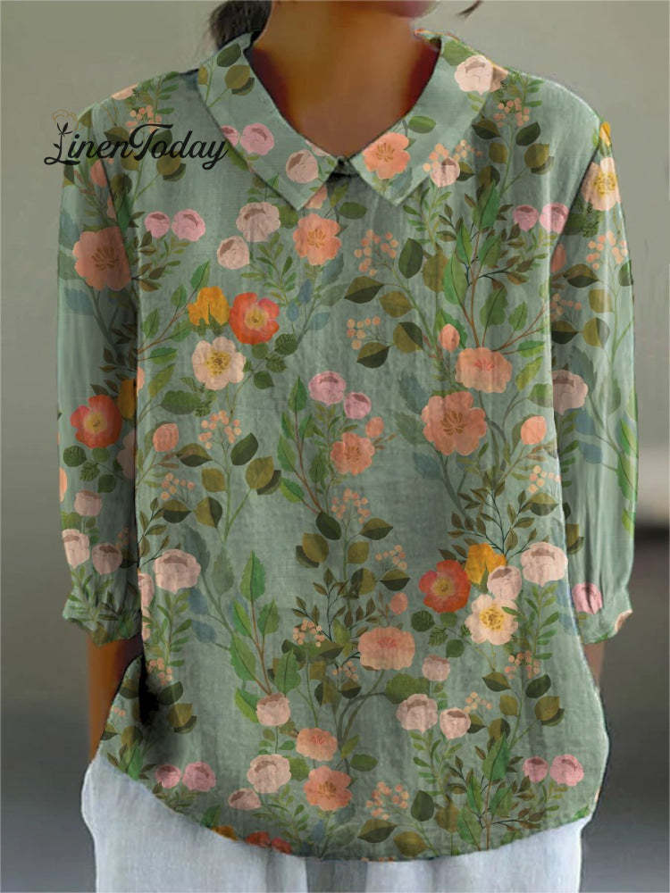 Women's Retro Floral Print Casual Cotton And Linen 3/4 Sleeve Shirt