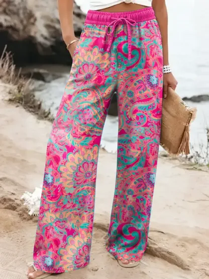 Women's Retro Multicolor Paisley Floral Art Printed Cotton And Linen Casual Pants