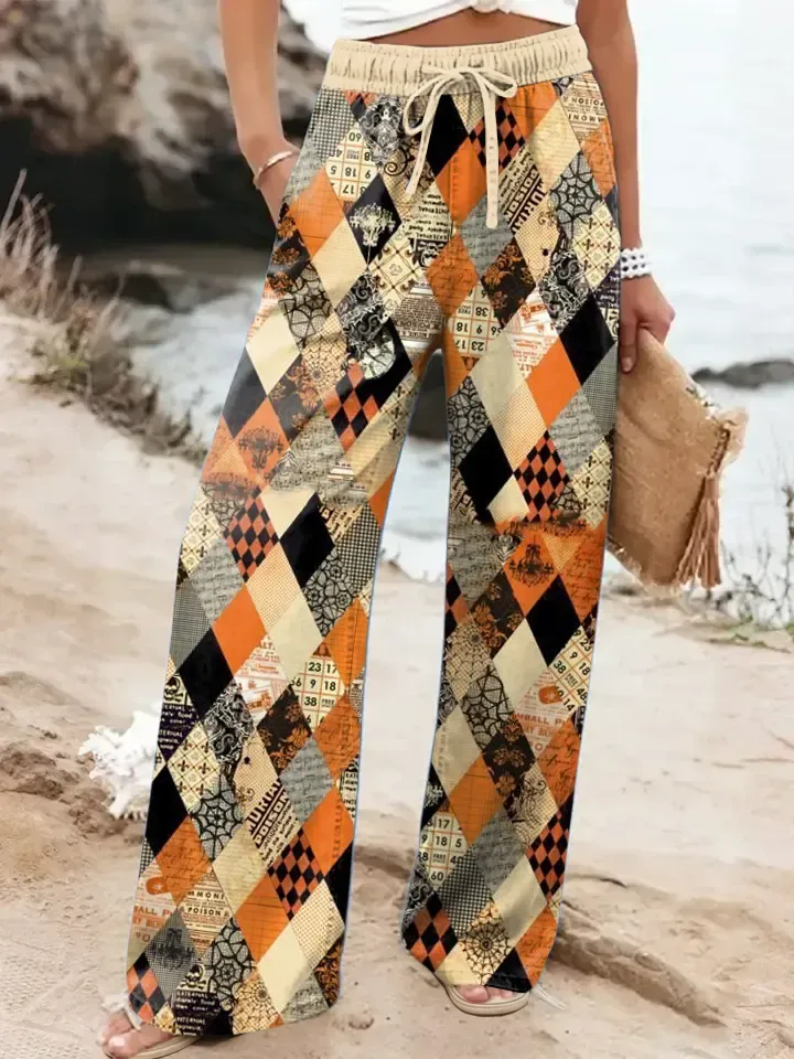 Women's Retro Multicolor Rhombus Art Printed Cotton And Linen Casual Pants