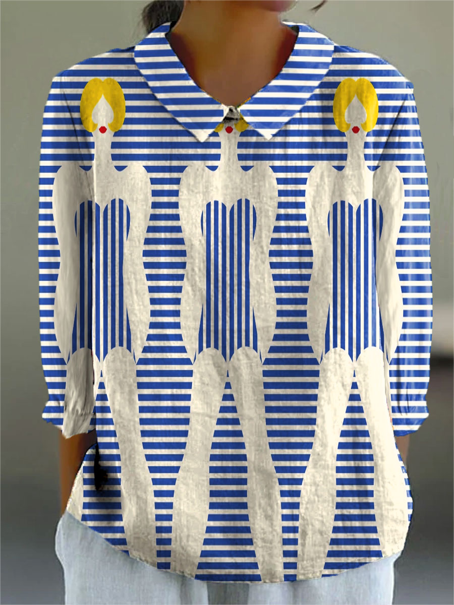 Women's Simple Abstract Geometric Stripes Human Figure Art Print Casual Cotton And Linen 3/4 Sleeve Shirt