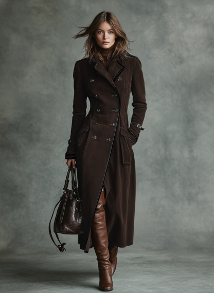 A sophisticated long coat crafted from soft suede, featuring classic trim accents and a double-breasted front. This elegant coat is designed with a refined lapel collar and a tailored silhouette, perfect for adding timeless style to your cold-weather wardrobe.