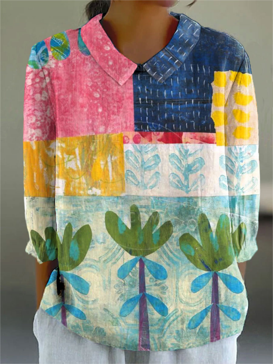 Women's Vintage Abstract Geometric Flower Art Print Casual Cotton And Linen 3/4 Sleeve Shirt