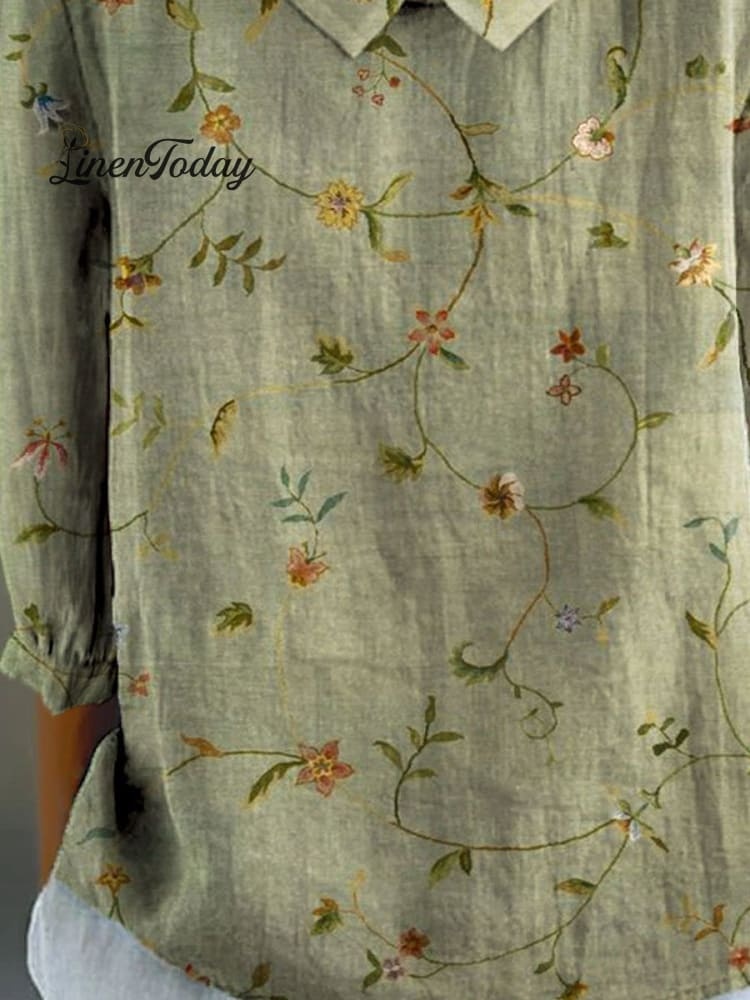 Women's Vintage Floral Art Print Casual Cotton And Linen 3/4 Sleeve Shirt