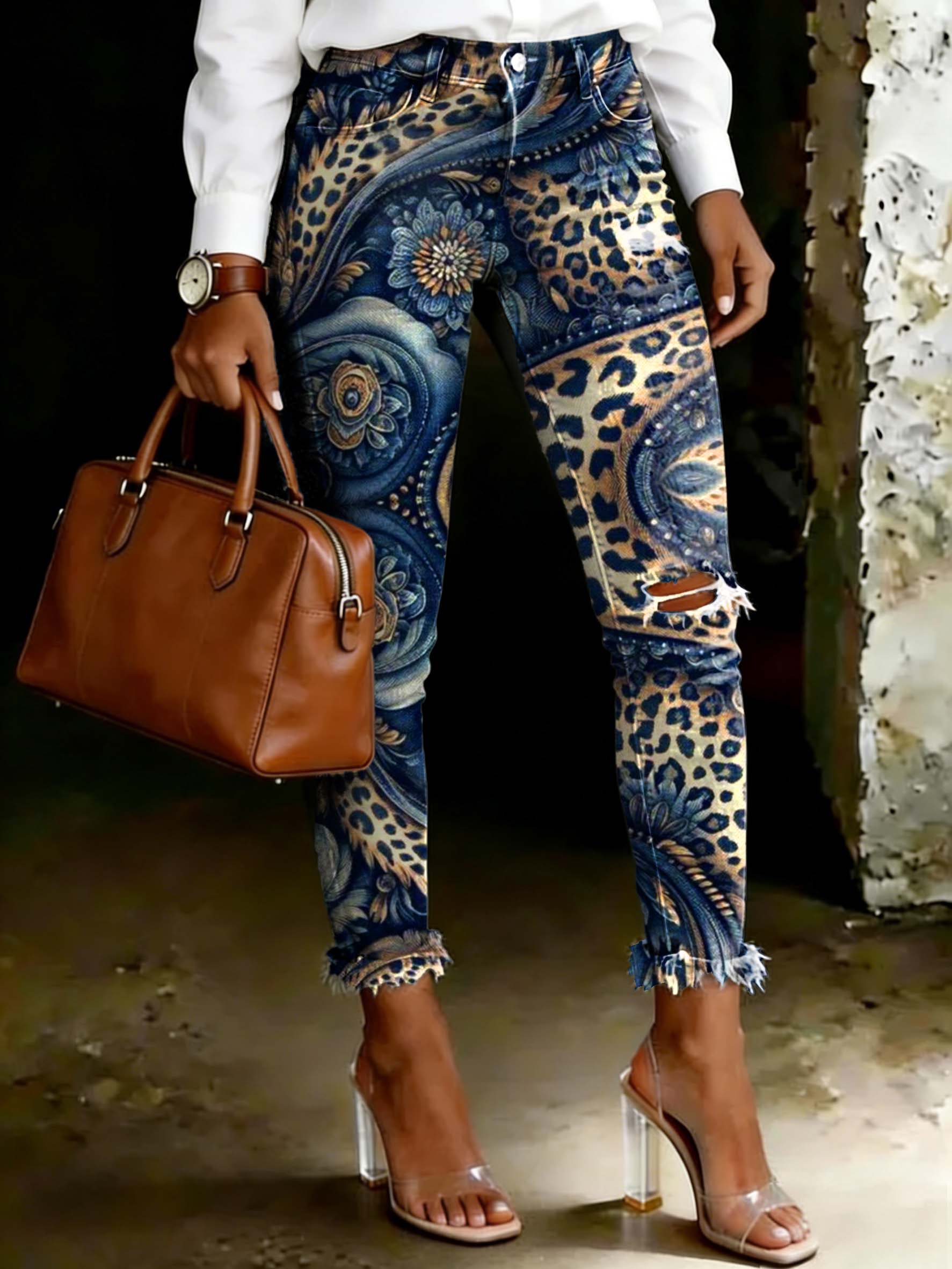 Women's Vintage Floral Leopard Print Art Ripped Skinny Jeans