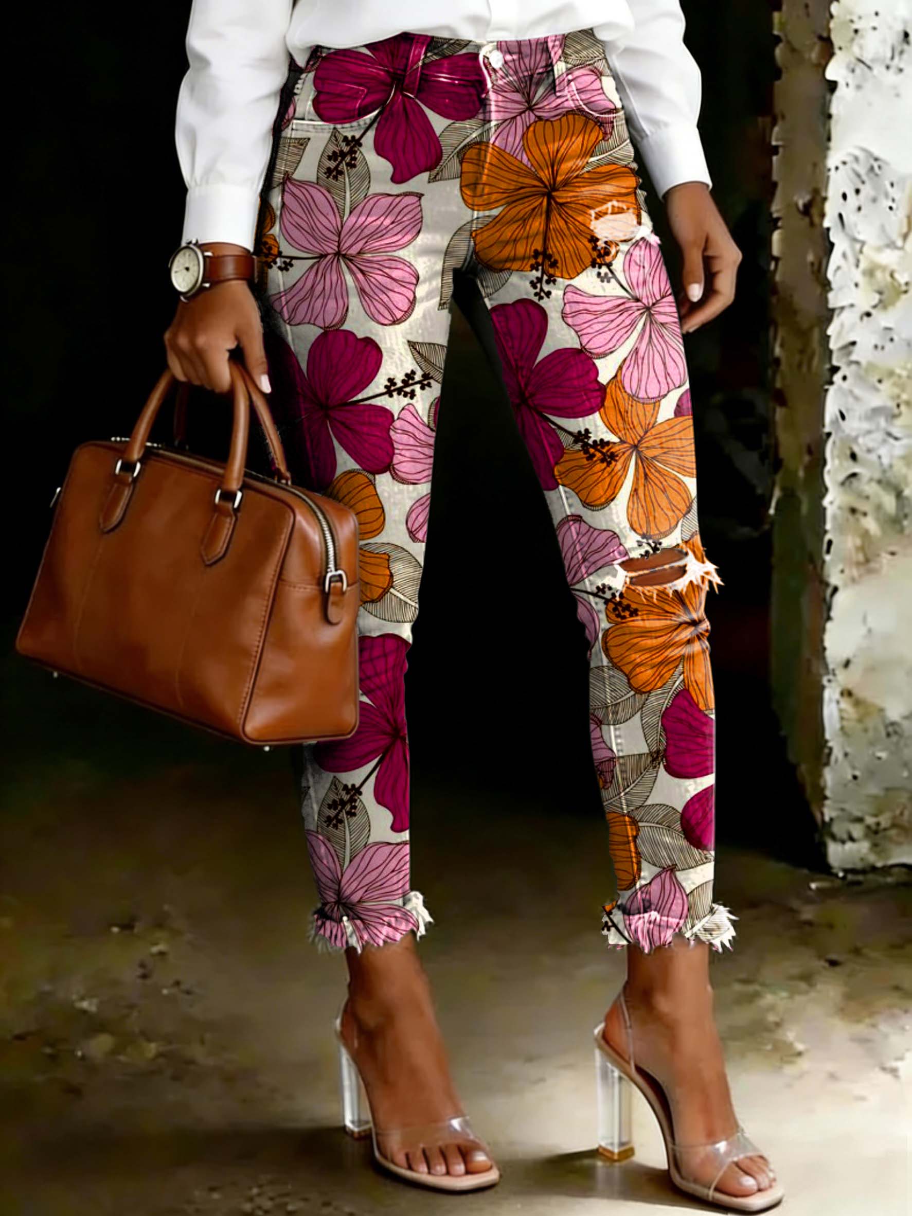 Women's Vintage Floral Print Art Ripped Skinny Jeans
