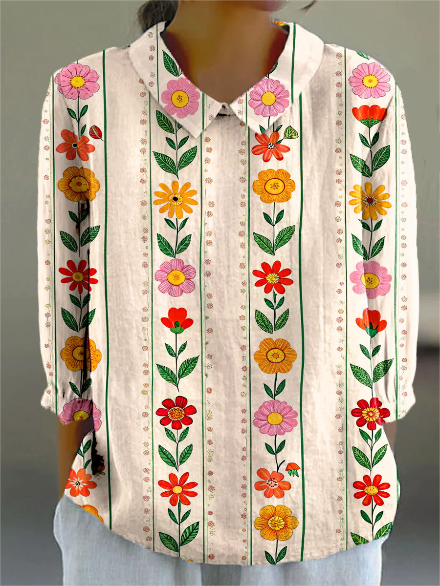 Women's Vintage Flower Print Casual Cotton And Linen 3/4 Sleeve Shirt