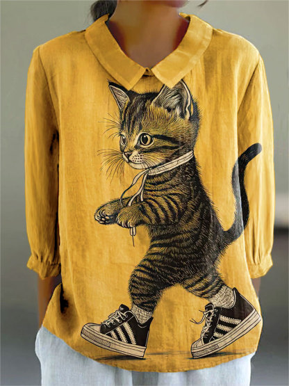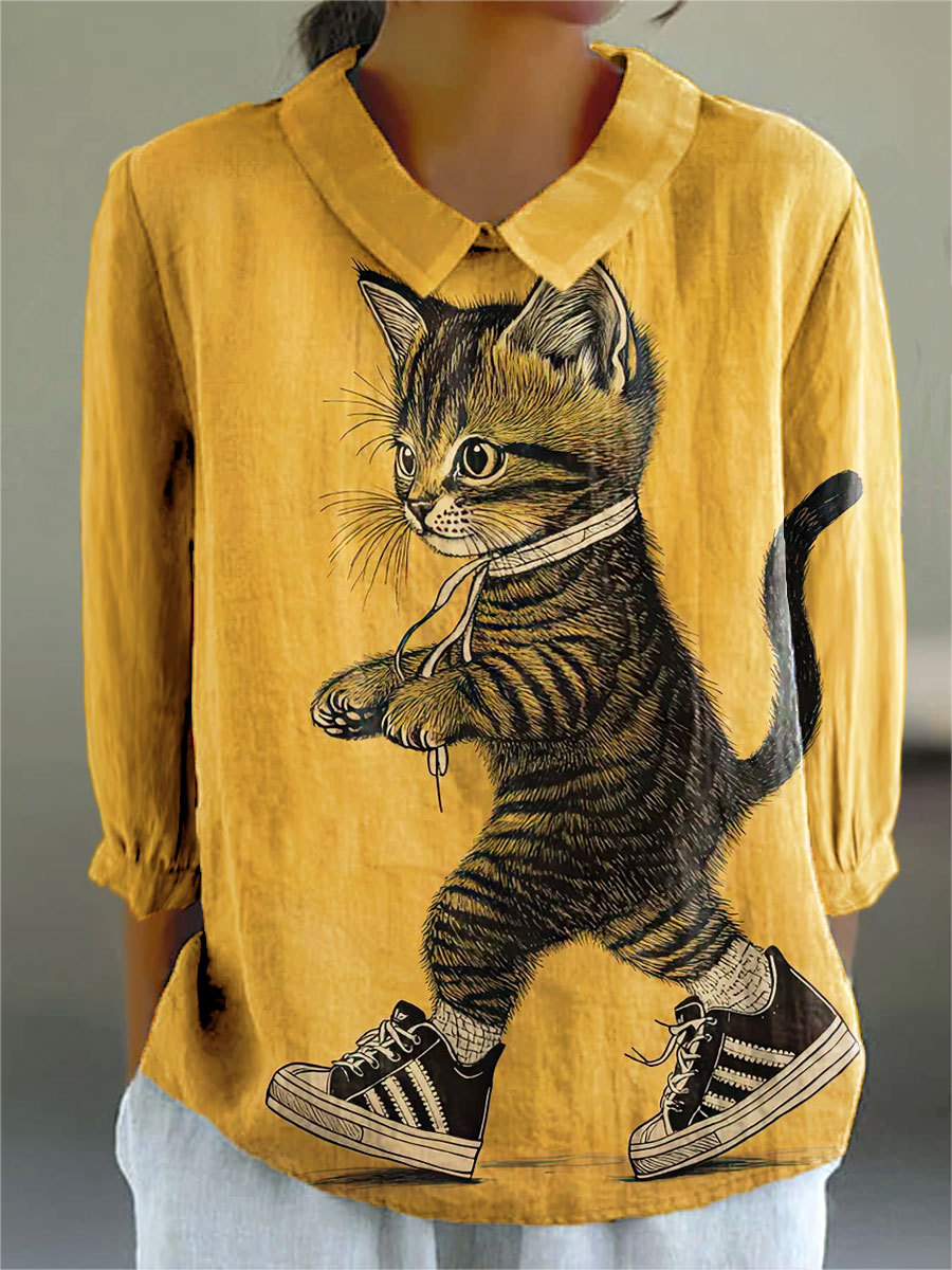 Women's Vintage Funny Cute Cat Art Print Casual Cotton And Linen 3/4 Sleeve Shirt
